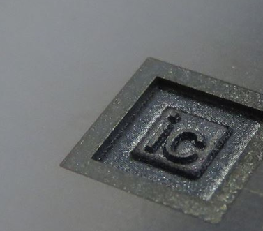 Bei der Weissgravur wird die Oberfläche fein angeschmolzen und mikrostrukturiert. Es entsteht ein heller Kontrast mit sehr geringer Eindringtiefe (typisch < 5 µm) – sauber, schmaucharm und besonders geeignet für dunkle Edelstahloberflächen.